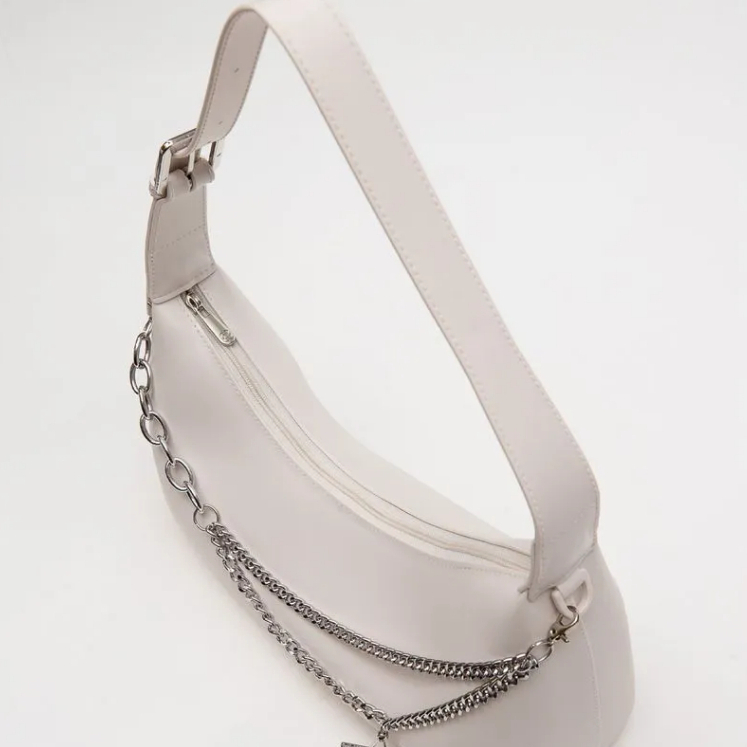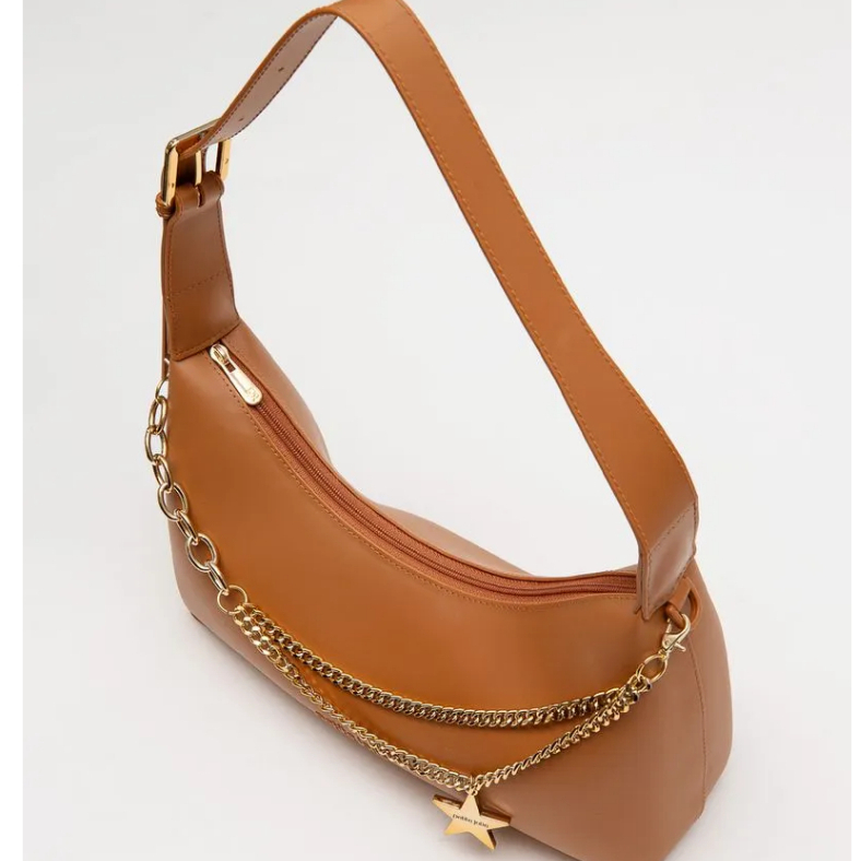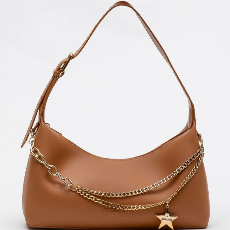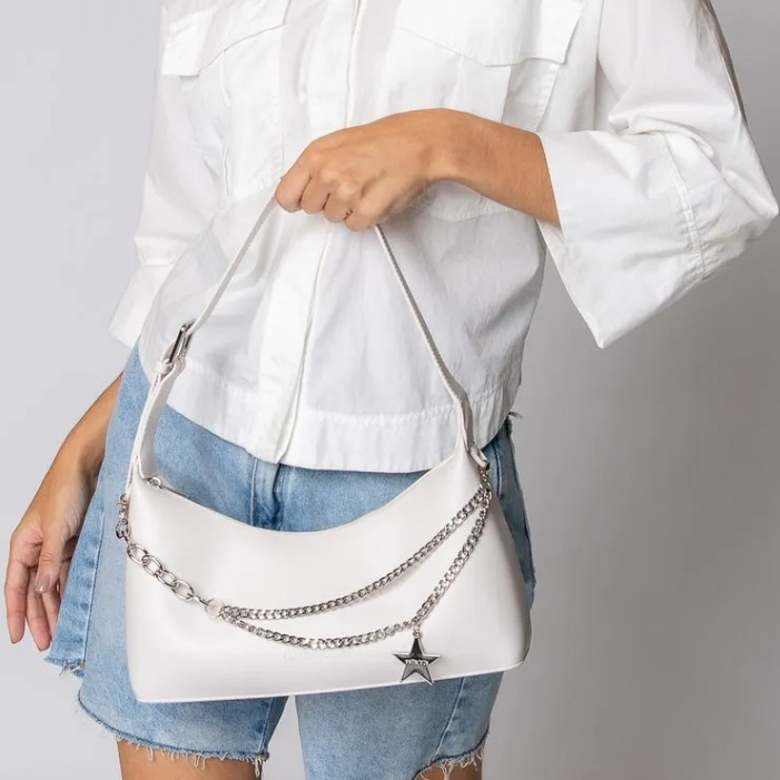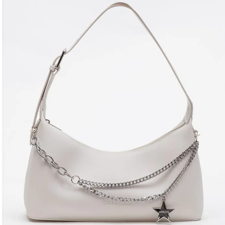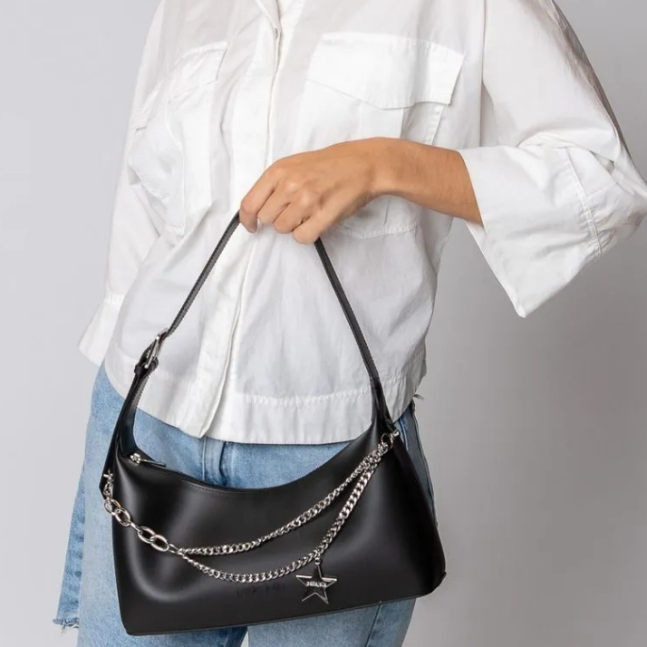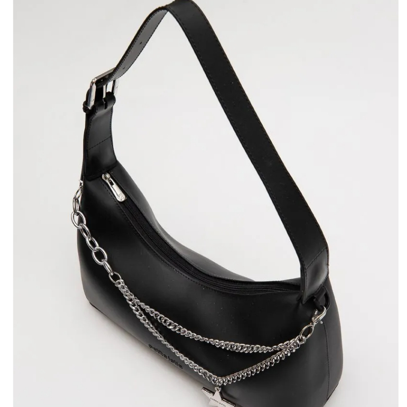 Bolsa estilo baguete, produzida em J-Lastic. O modelo conta com acabamento fosco, alça de ombro, regulagem por fivela e fechamento por zíper. É macia, super espaçosa e confortável de usar. O modelo conta também com aplicação em correntaria na parte frontal, que mistura tipos diferentes e correntes. O charme fica todo por conta do pingente de estrela, que dá um ar Y2K ao produto. Essa corrente é removível e pode ser usada como acessório de calça ou colar.